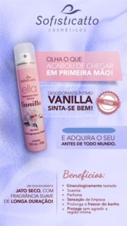 O "Desodorante ìntimo Vanilla" da Sofisticato é formulado para proteger a região íntima dos maus odores, seu jato seco é absorvido rapidamente pela pele dando uma perfume e sensação de frescor duradouro.