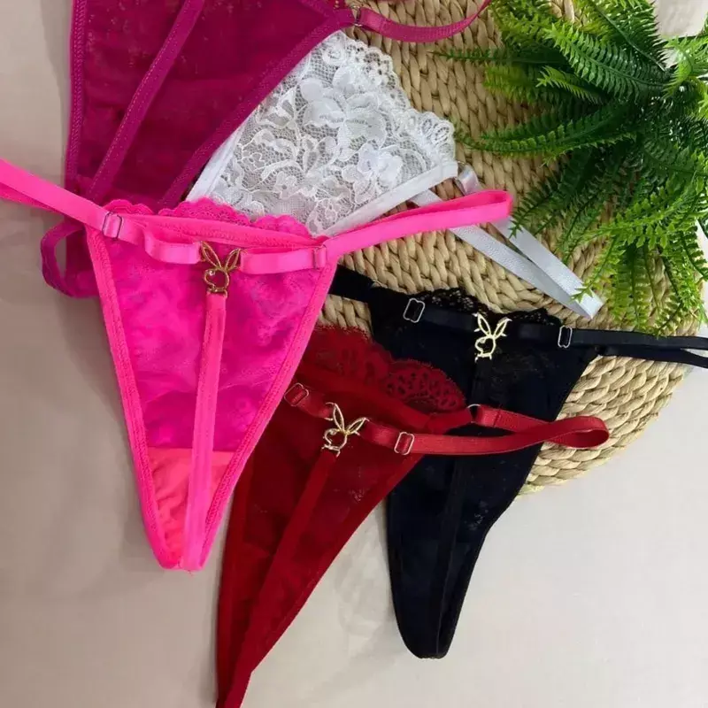 Calcinha fio dental de renda com pingente do coelho da Playboy na parte de trás, detalhe esse que dá charme e realça a sensualidade da peça. Possui as laterais com detalhes em renda. A parte da frente é mais coberta, toda confeccionada em renda transparente. A parte de trás é um fio cavado com modelagem mais alta, deixando o corpo mais bonito e valorizando o bumbum. A calcinha fio dental Playboy é ideal para seduzir quem você ama em seus momentos especiais, é uma lingerie delicada e avassaladora ao mesmo tempo.